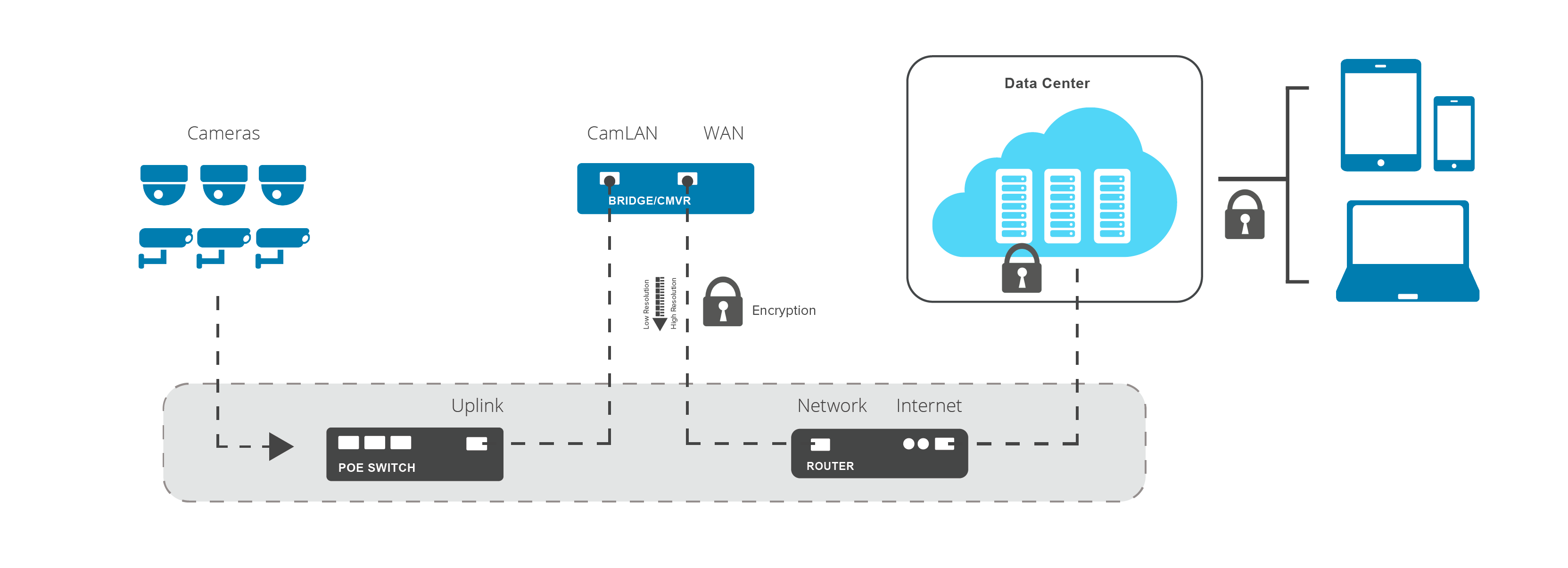 - Båndbreddekrav er min. 1 Mbit/s pr. kamera i upload hastighed (2 Mbit/s eller højere er anbefalet).